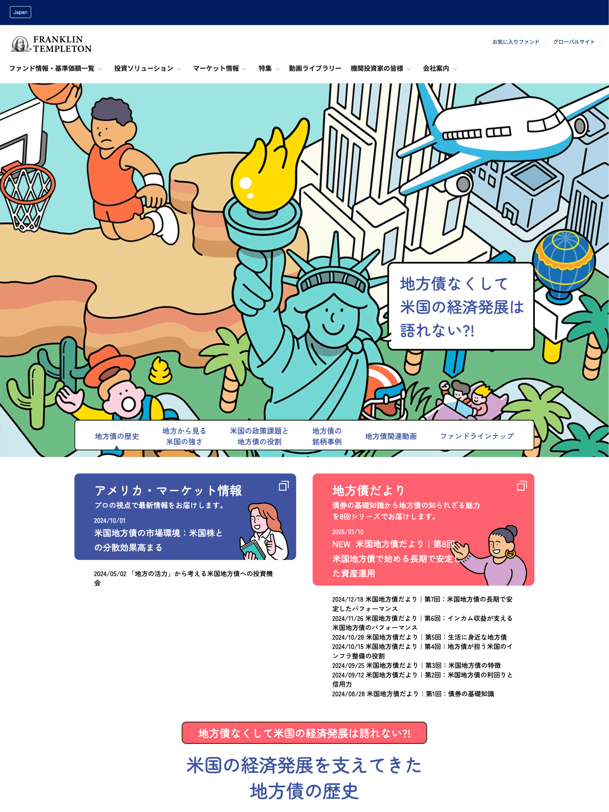 フランクリン・テンプルトン・ジャパンの米国地方債特集「地方債なくして米国の経済発展は語れない?!」。地方債が米国の経済発展を支えてきた歴史などの地方債に関する知識や、ファンドのラインナップなどが紹介されています。インフォグラフィックを効果的に使っており、米国地方債についての知識がない人にもわかりやすく説明されています。