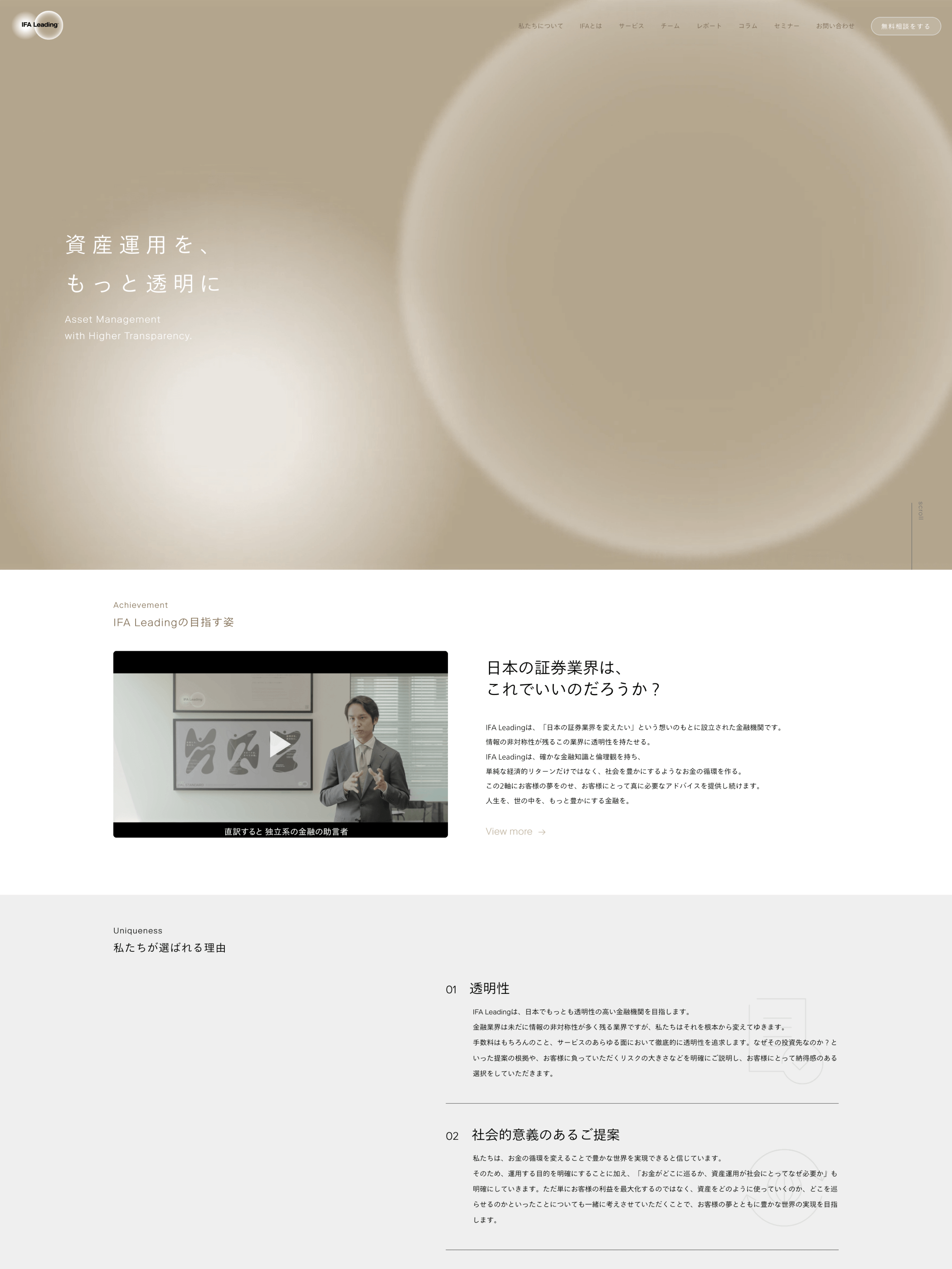 独立系ファイナンシャルアドバイザー(IFA)法人「IFA Leading」のWebサイト。手数料や投資先の選定根拠、リスクなどにおける透明性を重視しており、サイト全体も透明感のあるデザインで統一されています。