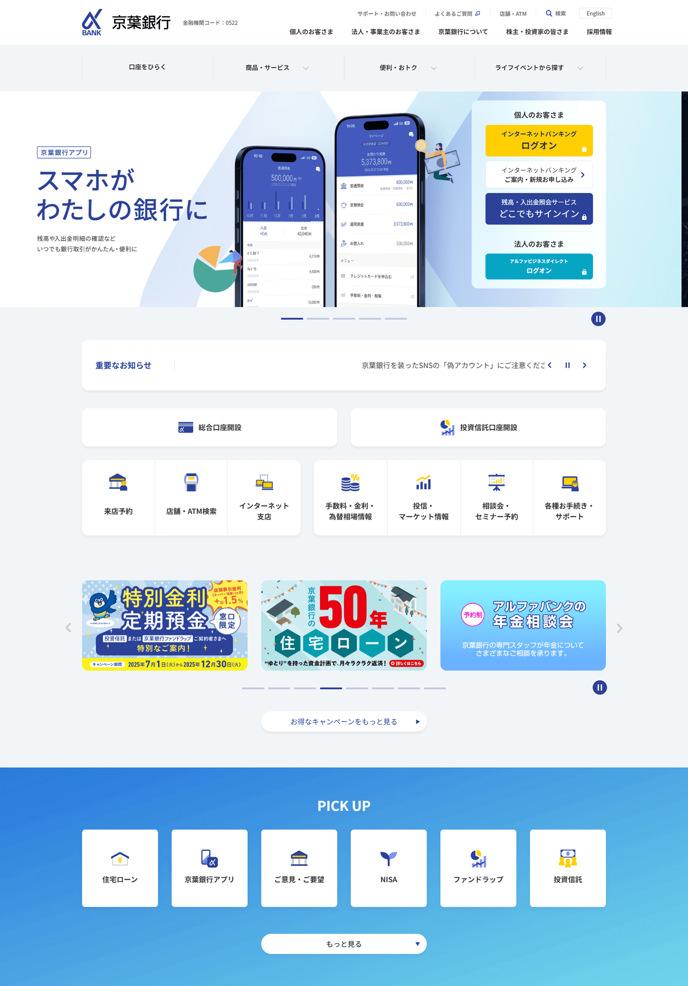 千葉県を地盤とする地方銀行「京葉銀行」のWebサイト。インターネットバンキングやキャッシュレス対応といったデジタルサービスに力を入れており、サイトでもトップにスマホアプリの画像を配置するなど、デジタル化への注力が伝わるデザインになっています。