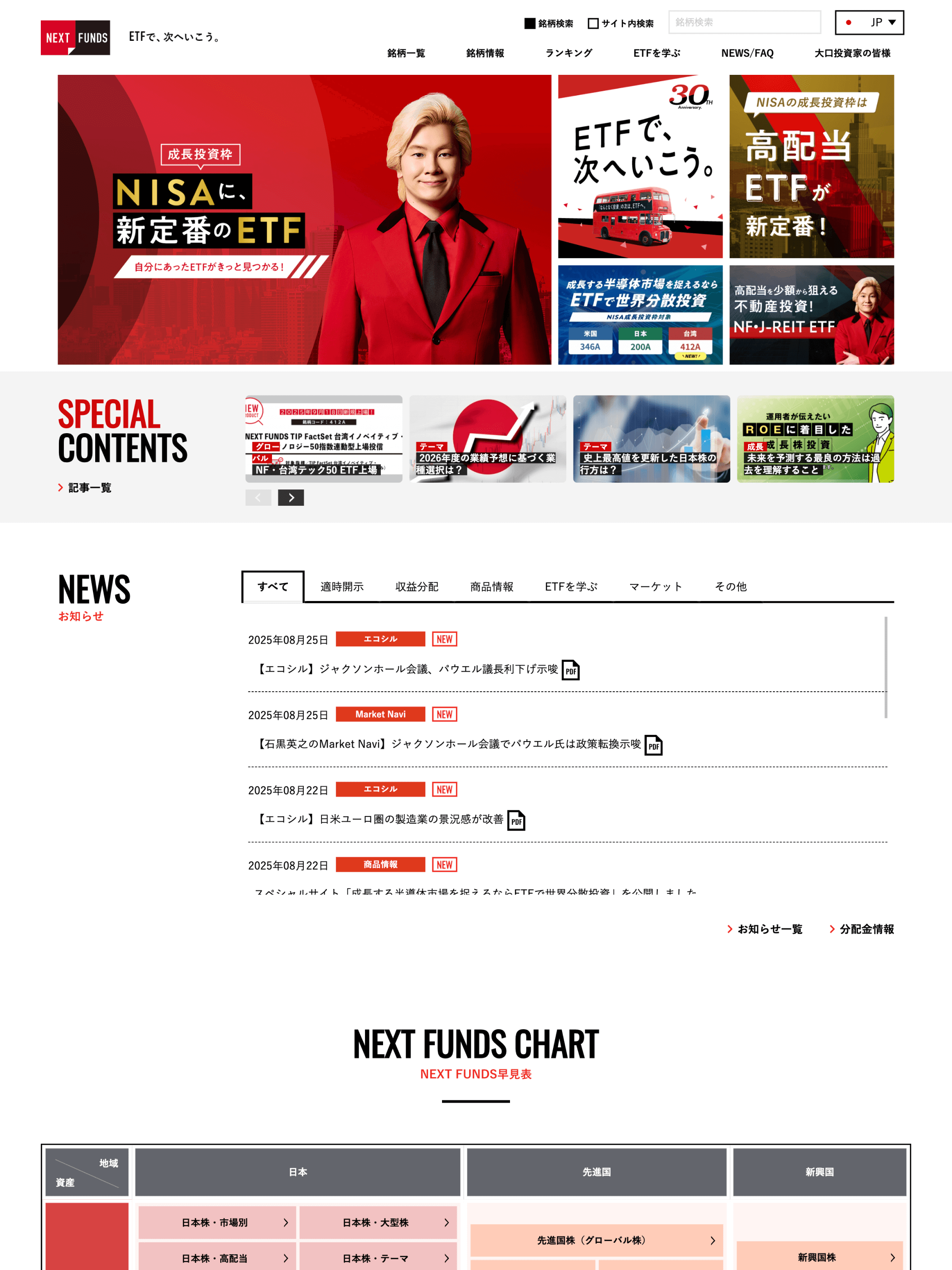 野村アセットマネジメントの特設サイト「NEXT FUNDS」。ETFについての知識を深められる記事や、野村アセットマネジメントのETF「NEXT FUNDS」の特集ページが集められています。サイトトップでは、ETFに関係する知らせやお気に入りに登録した銘柄の情報を確認できます。
