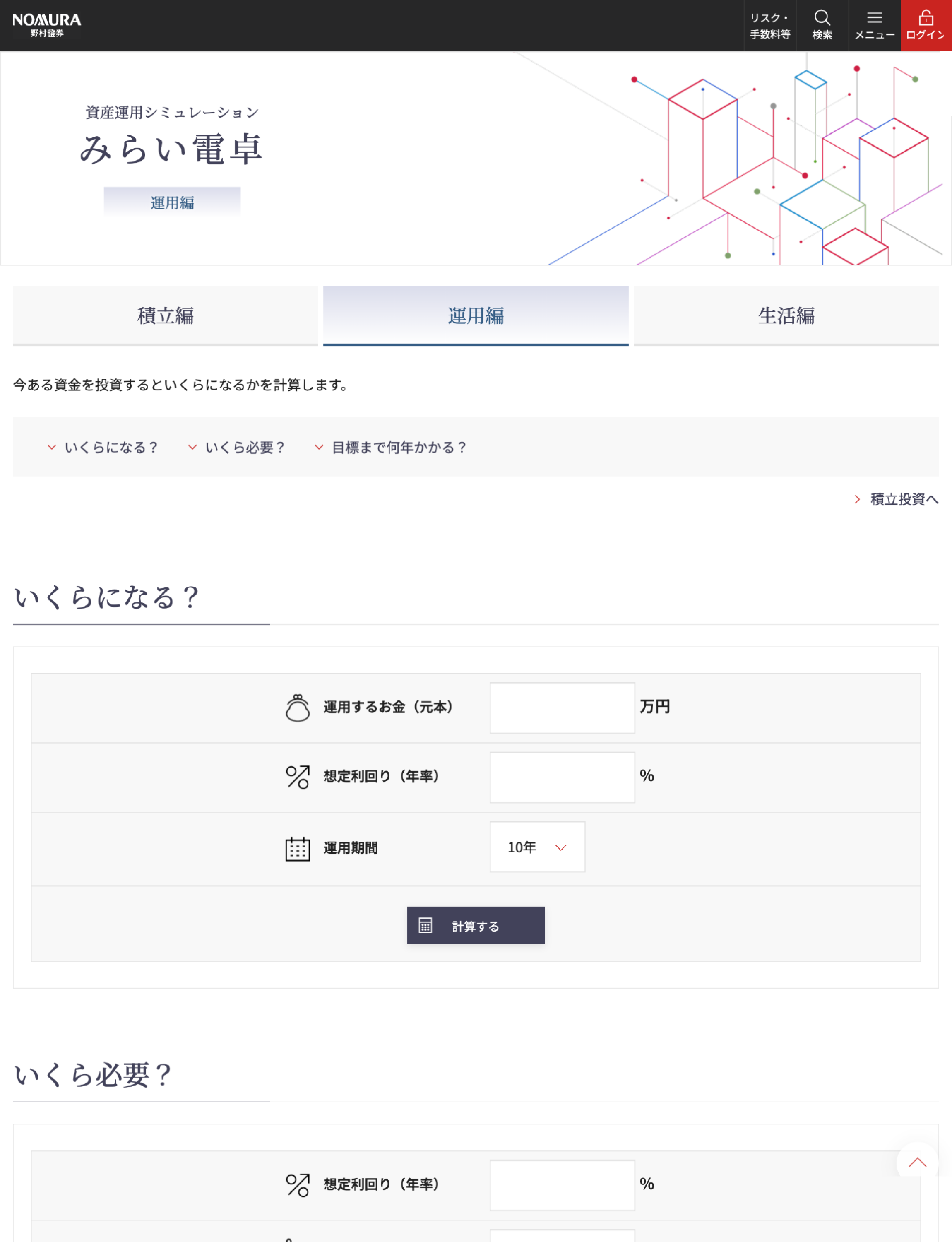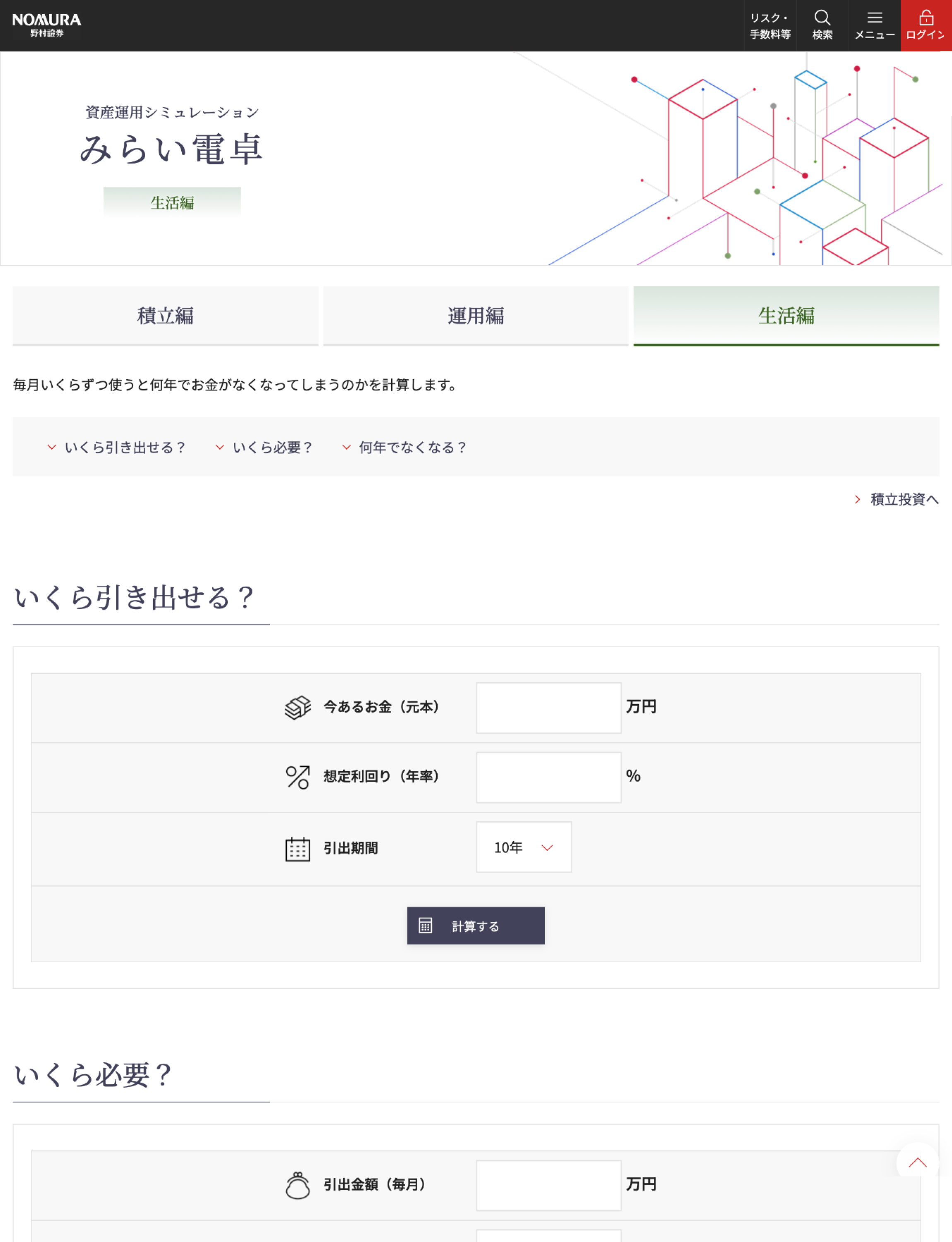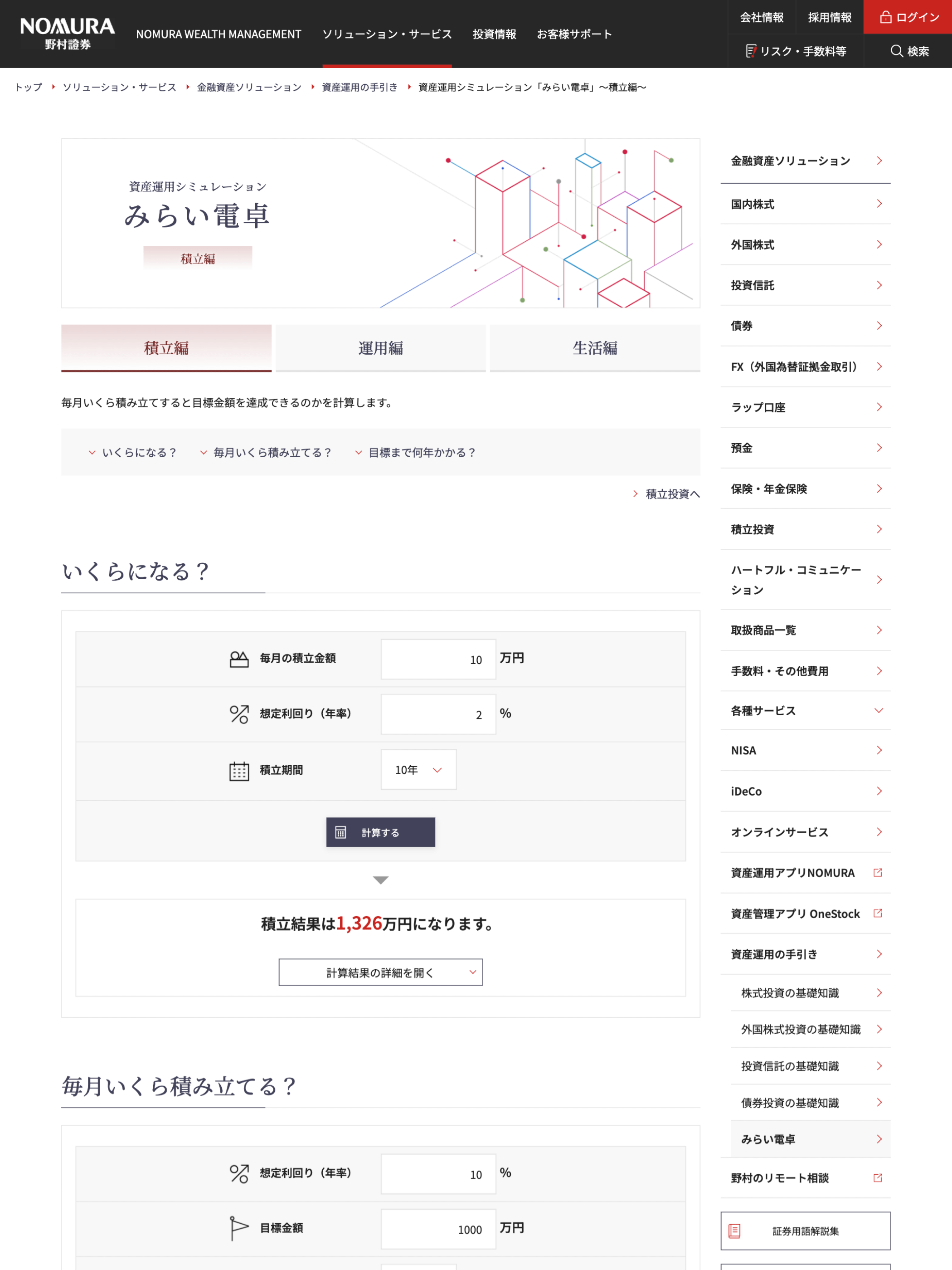 野村證券のシミュレーションページ「みらい電卓」。