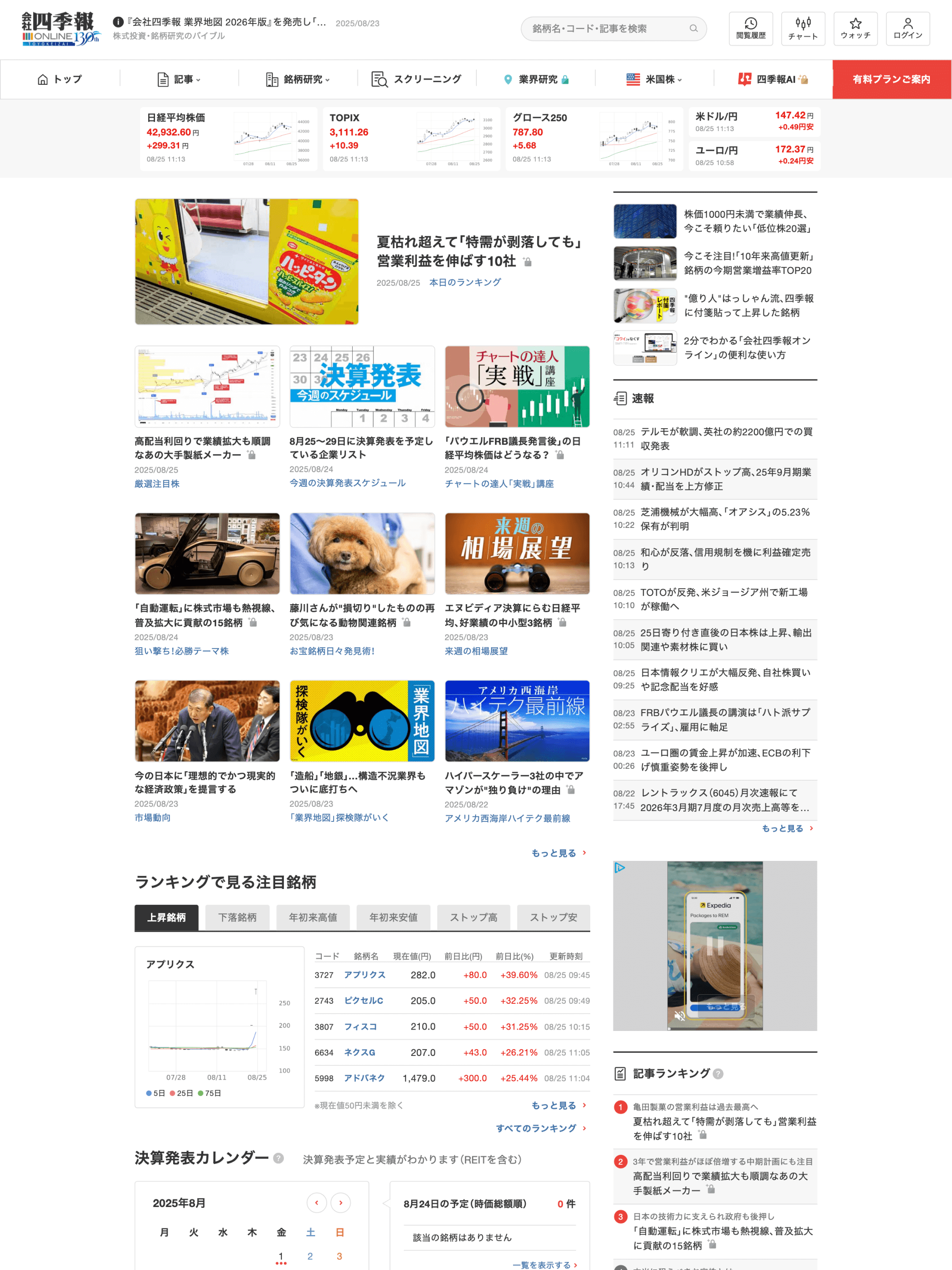 最新の株式に関するニュース・知識や業績予想を解説する記事のほか、銘柄比較やスクリーニングなどのツールを提供しています。