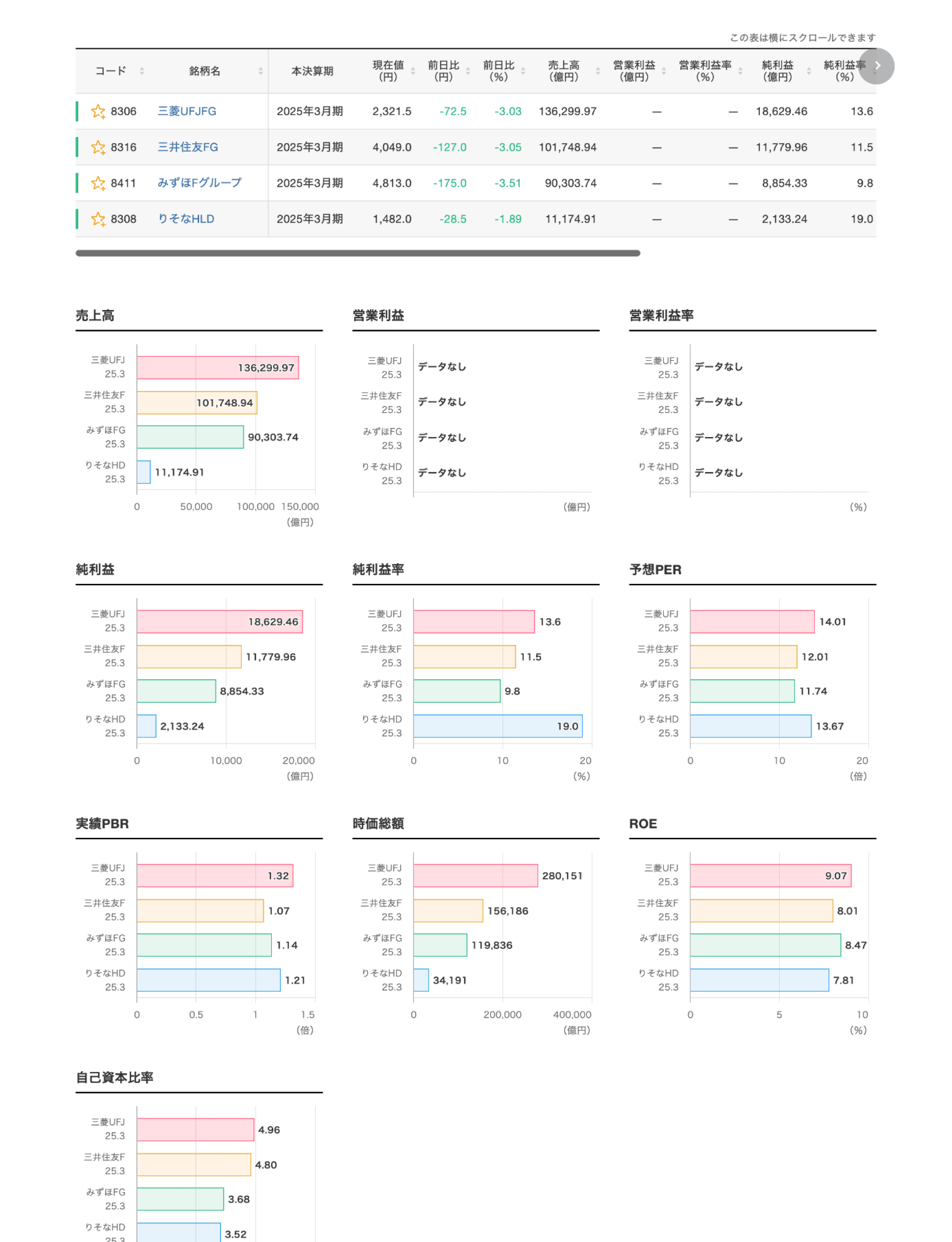 各銘柄の指標はグラフやチャートで表示され、直感的に銘柄比較を行えます。
