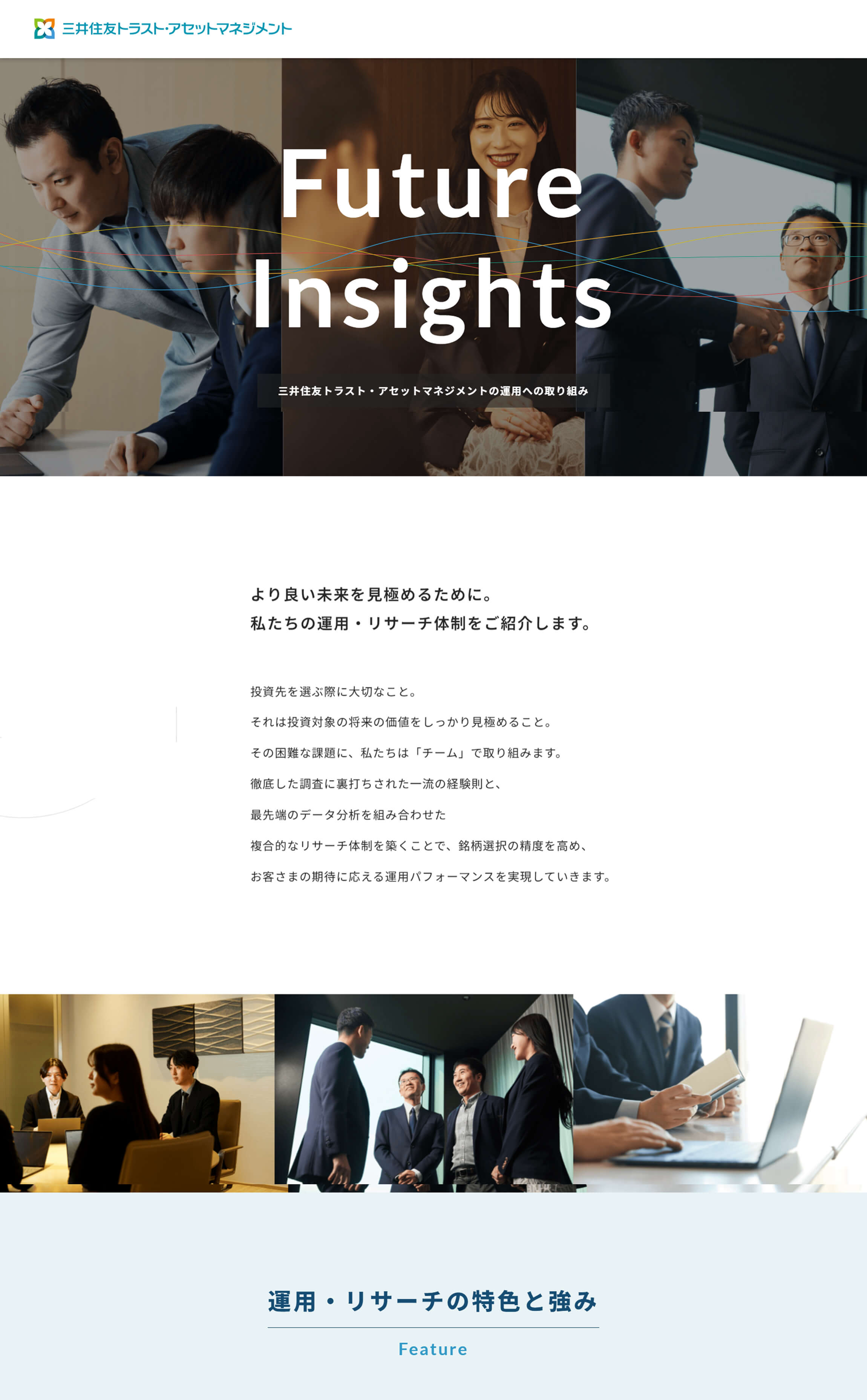 三井住友トラスト・アセットマネジメントの特設ページ「SMTAMの運用・リサーチ体制 Future Insights」。社員の写真を交えながら運用・リサーチ体制が詳しく紹介されており、顔が見える安心感を与えています。