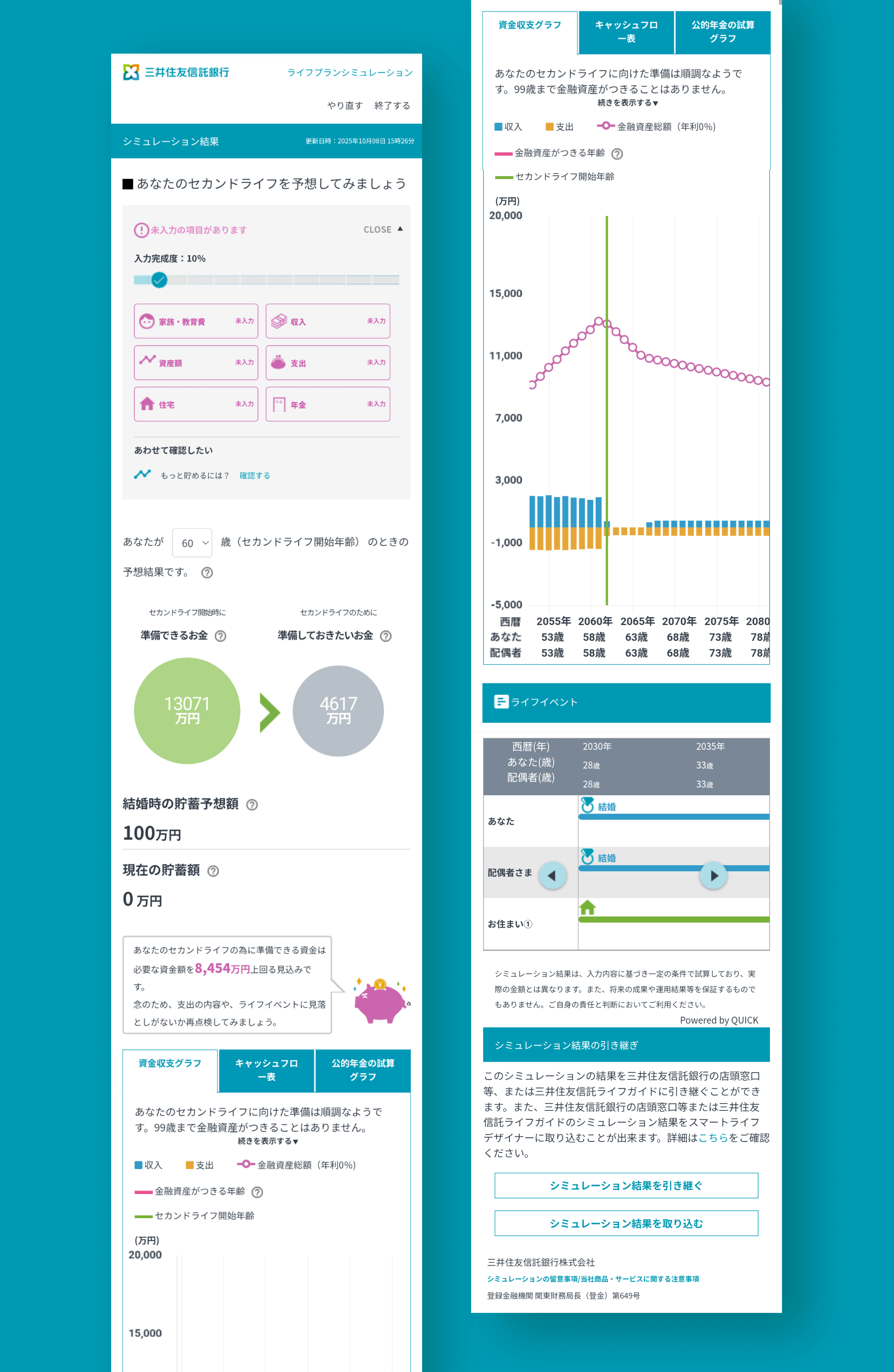 シミュレーション結果では、セカンドライフ開始時に必要なお金を準備できそうか確認できます。また、資金収支グラフでは、収支と金融資産総額、金融資産はいつ尽きてしまうかなどが可視化されます。