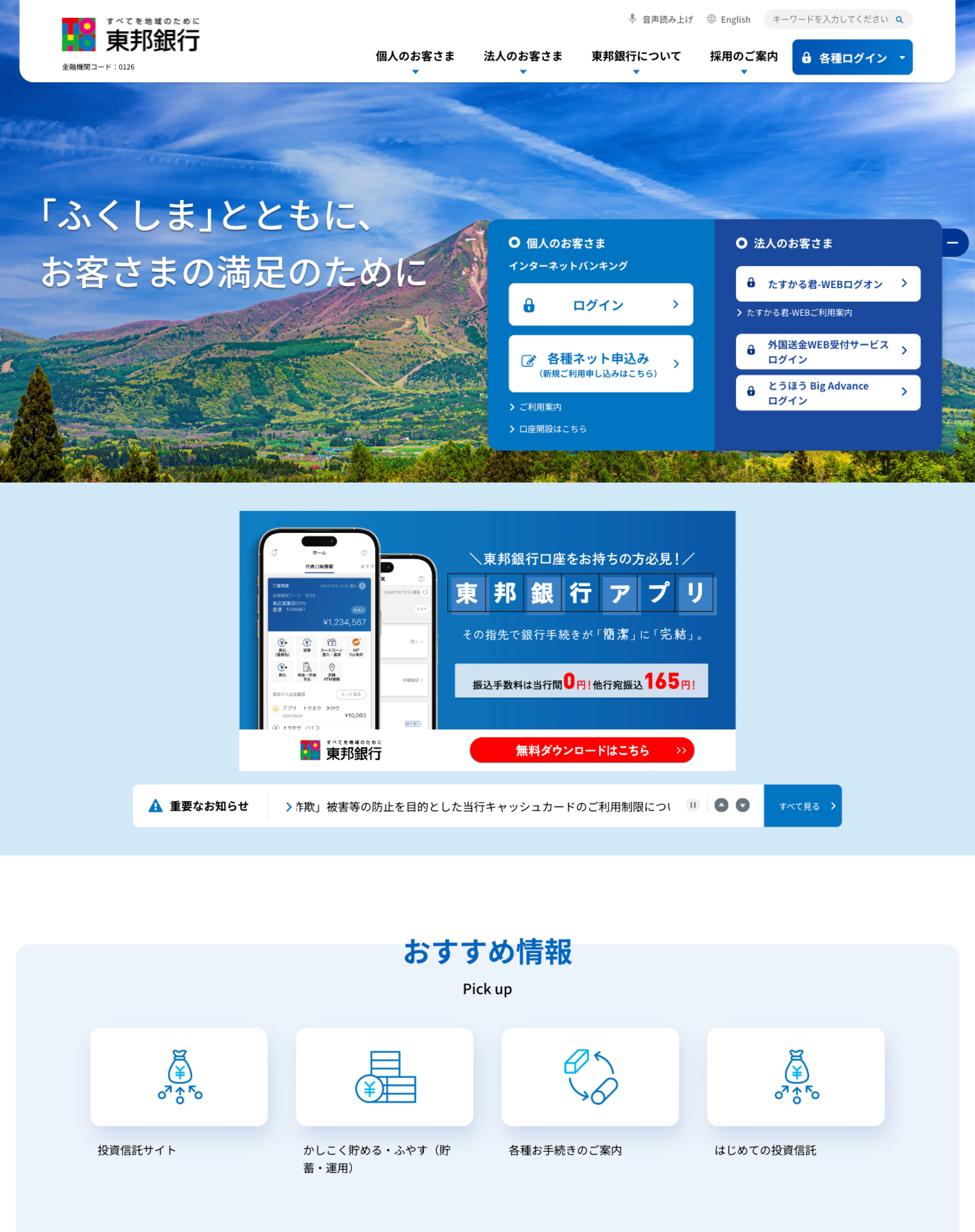 福島県を地盤とする地方銀行「東邦銀行」のWebサイト。 東日本大震災からの復興支援をグループ全体の最重要課題としており、地域産業の再生・創出支援や地域コミュニティへの貢献にも力を入れている点が特徴です。ヒーローイメージには福島を代表する山「磐梯山」が用いられており、地域への強い想いが伝わるデザインになっています。