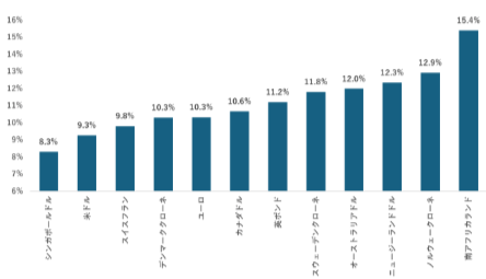 変動リスクは投資において重要な概念ですが、個人が計測するのは難しい指標です。ご参考として、2009年末~2024年6月末の月次為替データでみたときのクロス円の主要通貨別の1年あたりの変動リスクは次のとおりです。