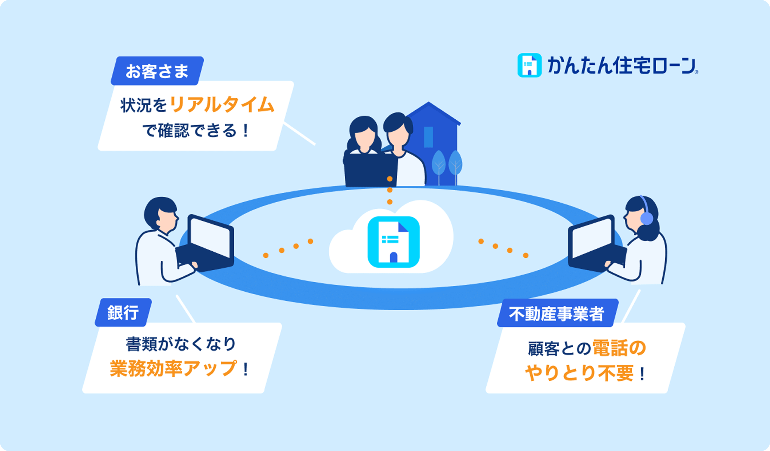 「かんたん住宅ローン」は、住宅ローンに申し込むお客さまと不動産事業者、そして住信SBIネット銀行や銀行代理業者をつなぐ B to B to C デジタルプラットフォームです。住宅ローンの申込から実行までをすべてオンラインで完結できます。