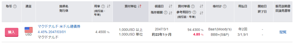債券マルシェの米ドル建て債券の場合、次の買付単位の債券があります。