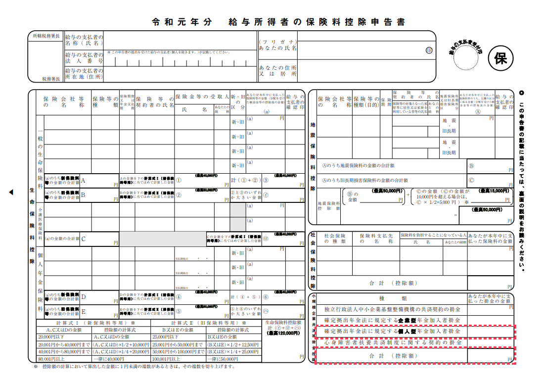 会社員や公務員の方は、11月頃に勤務先から年末調整の書類を渡されると思います。iDeCo(イデコ)の所得控除をする際は、年末調整書類の中の「給与所得者の保険料控除申告書」に記入します。 右下にある「確定拠出年金に規定する個人型年金加入者掛金」という欄に、その年のiDeCo(イデコ)の掛金合計額を記入してください(下の画像の赤枠で囲った部分です)。 例えば、毎月2万円積み立てている方は、両方とも「240,000」と記入すればOKです。