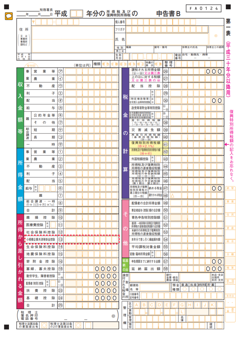 「確定申告書B・第一表」の左側にある「小規模企業共済等掛金控除⑬」という欄に、その年のiDeCo(イデコ)の掛金合計額を記入してください(下の画像の赤枠で囲った部分です)。 例えば、毎月6万円積み立てている方は、「720,000」と記入すればOKです。
