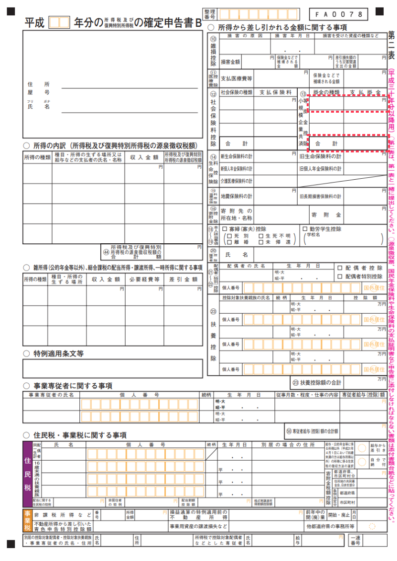 「確定申告書B・第二表」では、右上にある「⑬小規模企業共済等掛金控除」の掛金の種類の欄に、「個人型確定拠出年金」と記入し、支払掛金と合計の欄にそれぞれ、その年のiDeCo(イデコ)の掛金合計額を記入してください(下の画像の赤枠で囲った部分です)。 金額は、第一表と同じですね。