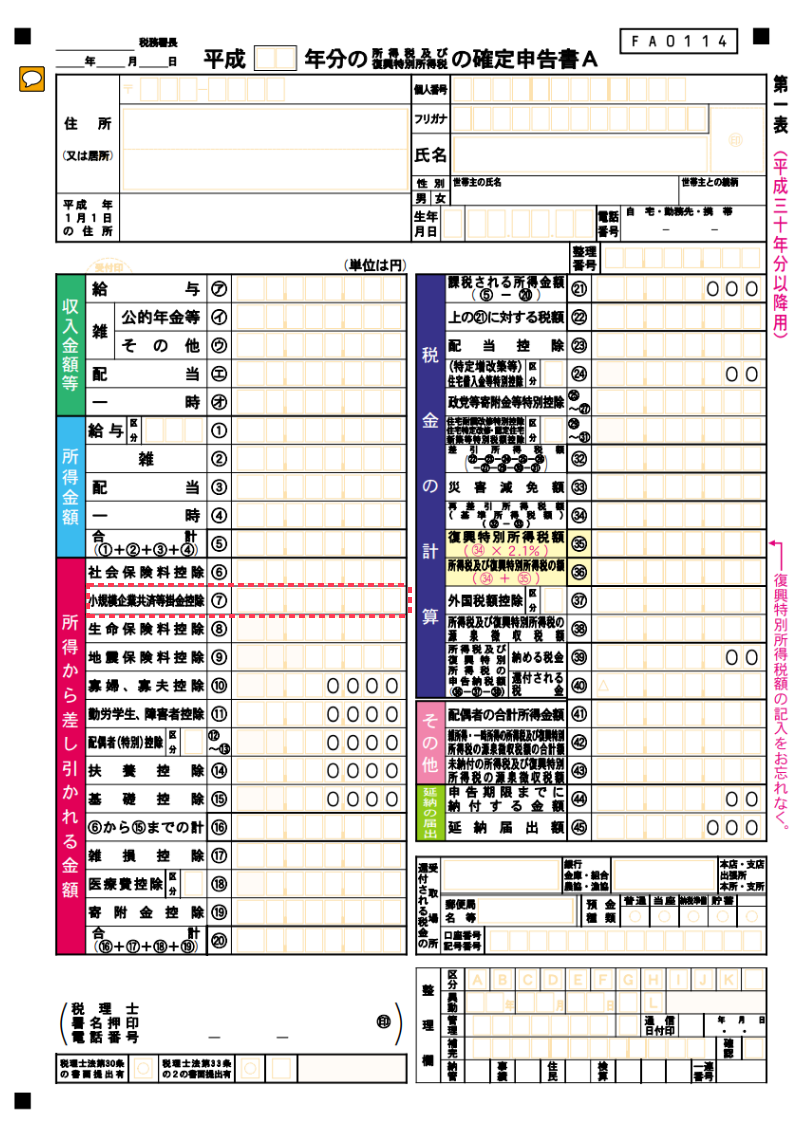 「確定申告書A・第一表」の左側にある「小規模企業共済等掛金控除⑦」という欄に、その年のiDeCo(イデコ)の掛金合計額を記入してください(下の画像の赤枠で囲った部分です)。 例えば、毎月2万円積み立てている方は「240,000」と記入すればOKです。
