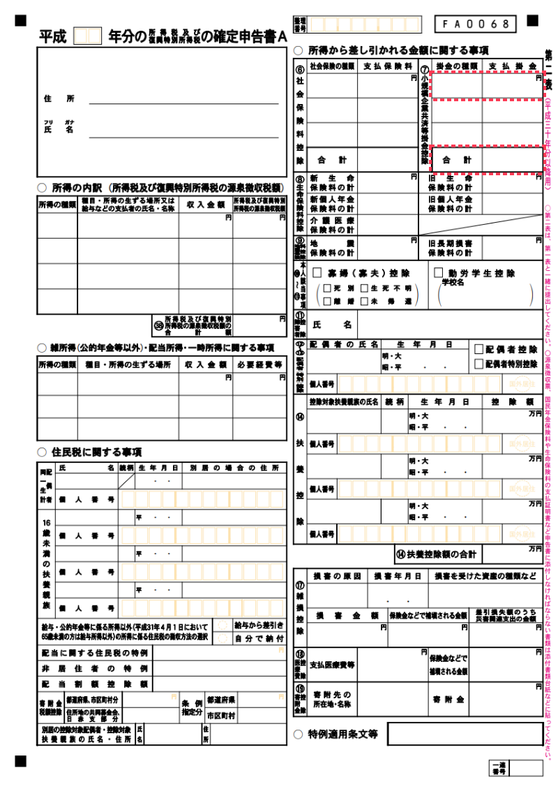 「確定申告書A・第二表」では、右上にある「⑦小規模企業共済等掛金控除」の掛金の種類の欄に、「個人型確定拠出年金」と記入し、支払掛金と合計の欄にそれぞれ、その年のiDeCo(イデコ)の掛金合計額を記入してください(下の画像の赤枠で囲った部分です)。 金額は、第一表と同じですね。